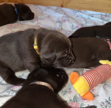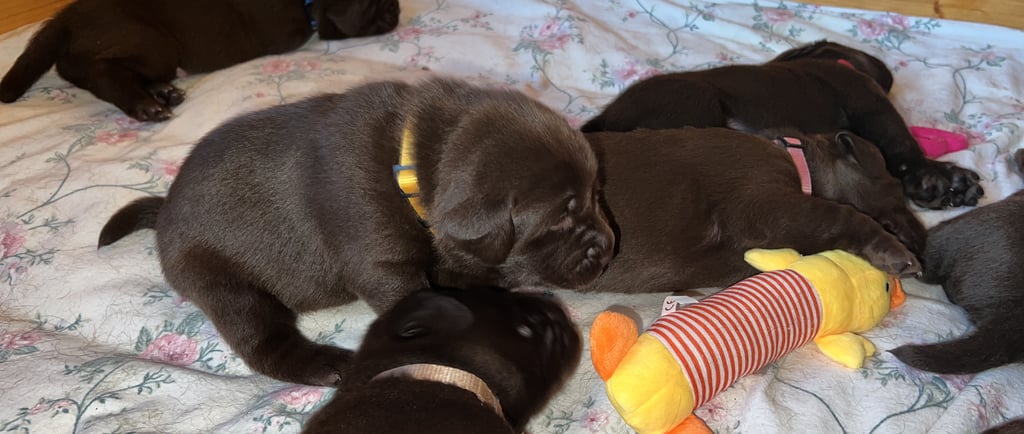 Unsere Welpen machen große Fortschritte: Die Augen sind nun geöffnet, und mit jedem Tag werden sie neugieriger. Erste wackelige Schritte, kleine Spielversuche und zaghaftes Knurren oder Bellen bringen Leben in die Wurfkiste. Auch untereinander wird nun mehr Kontakt aufgenommen. Alma ist weiterhin eine geduldige und fürsorgliche Mama – und wir genießen jede Minute mit den kleinen Fellnasen.