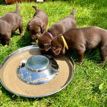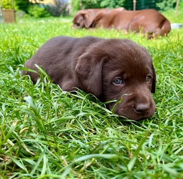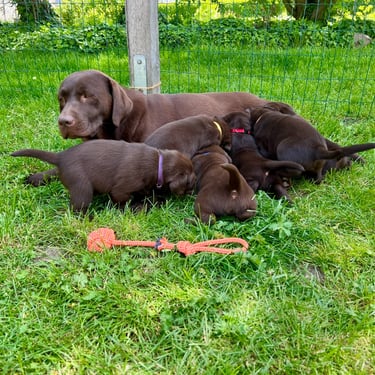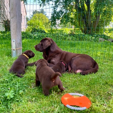 Was für eine spannende Woche! Unsere kleinen Abenteurer werden immer mutiger und neugieriger. Die ersten Spielversuche mit Geschwistern und Spielzeug bringen jede Menge Trubel und Freude in den Alltag. Auch die Koordination wird täglich besser – wackelige Schritte werden zu echten Mini-Rennen quer durch Hof und Garten. Kuscheleinheiten mit uns Zweibeinern genießen sie inzwischen sichtlich, und die kleinen Persönlichkeiten beginnen sich immer deutlicher zu zeigen. Es ist wunderschön zu sehen, wie aus winzigen Welpen richtige kleine Hunde werden!