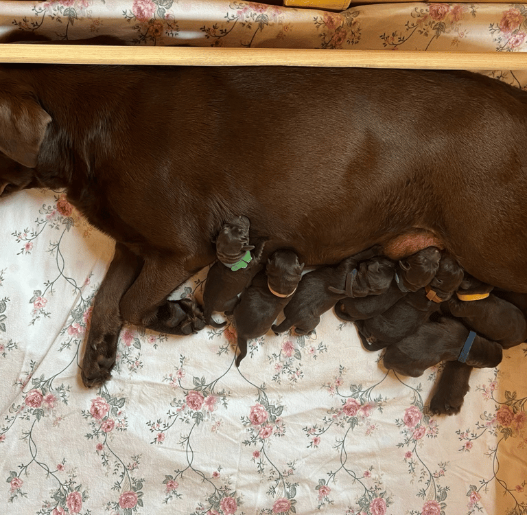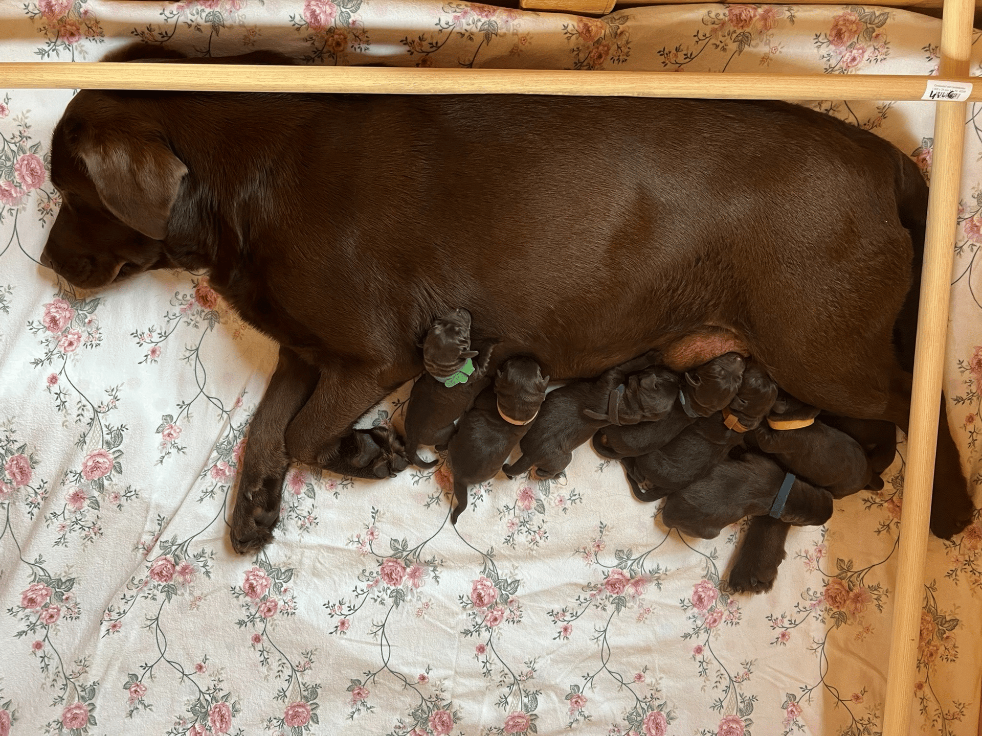 Heute hat unsere Alma drei Hündinnen und fünf Rüden zur Welt gebracht. Alle acht Welpen sind gesund und munter – und auch der Mama geht es bestens. Wir sind voller Dankbarkeit und Freude, dass die Geburt so reibungslos und instinktsicher verlaufen ist.